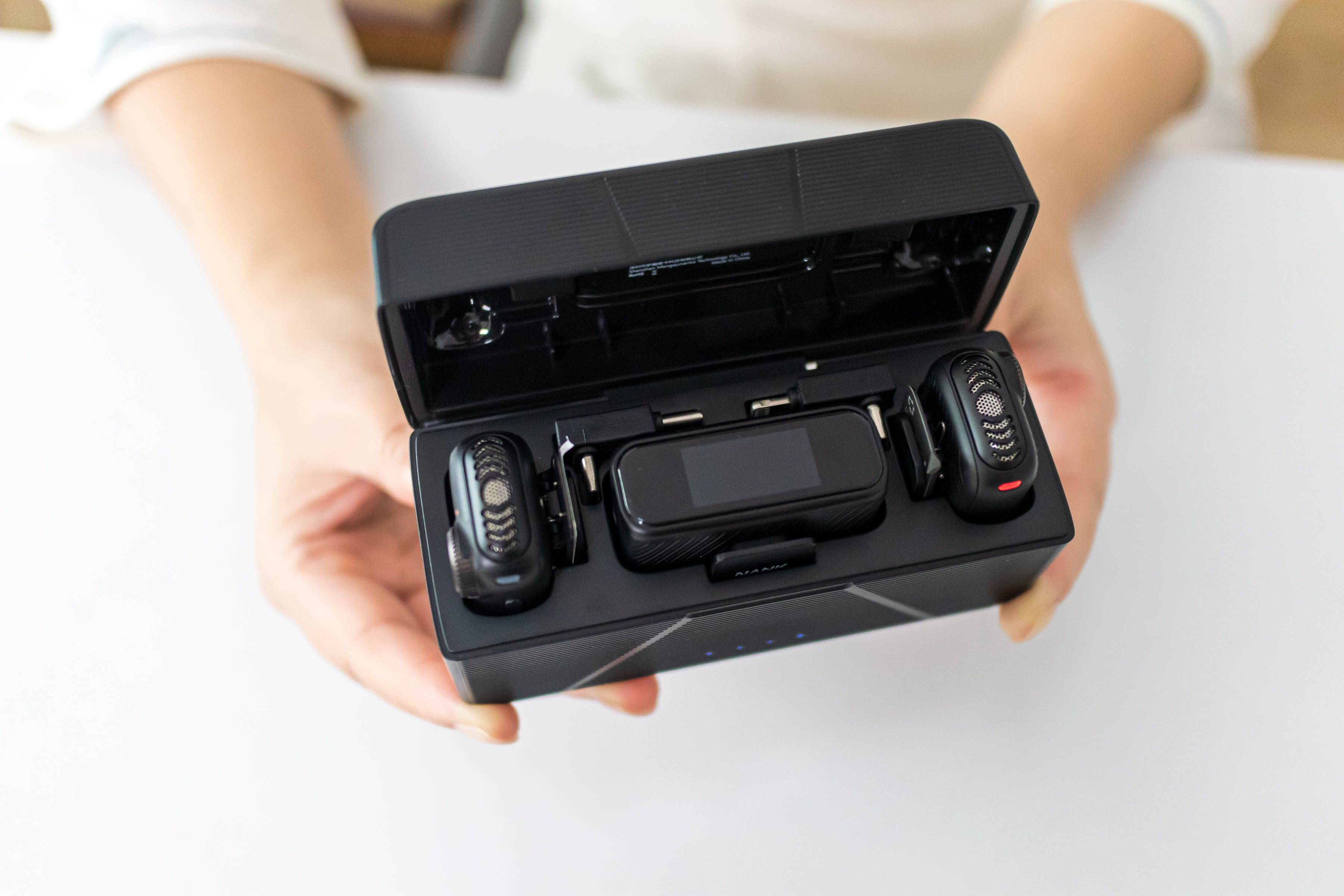 打开充电盒的瞬间,我竟有种打开化妆盒的错觉——内部空间规划得十分紧凑,不仅稳稳容纳着2支麦克风和接收器,还专门给两个转接头预留了位置,真正做到“一步到位”,拎起就能出发,完全不用费心整理配件。
