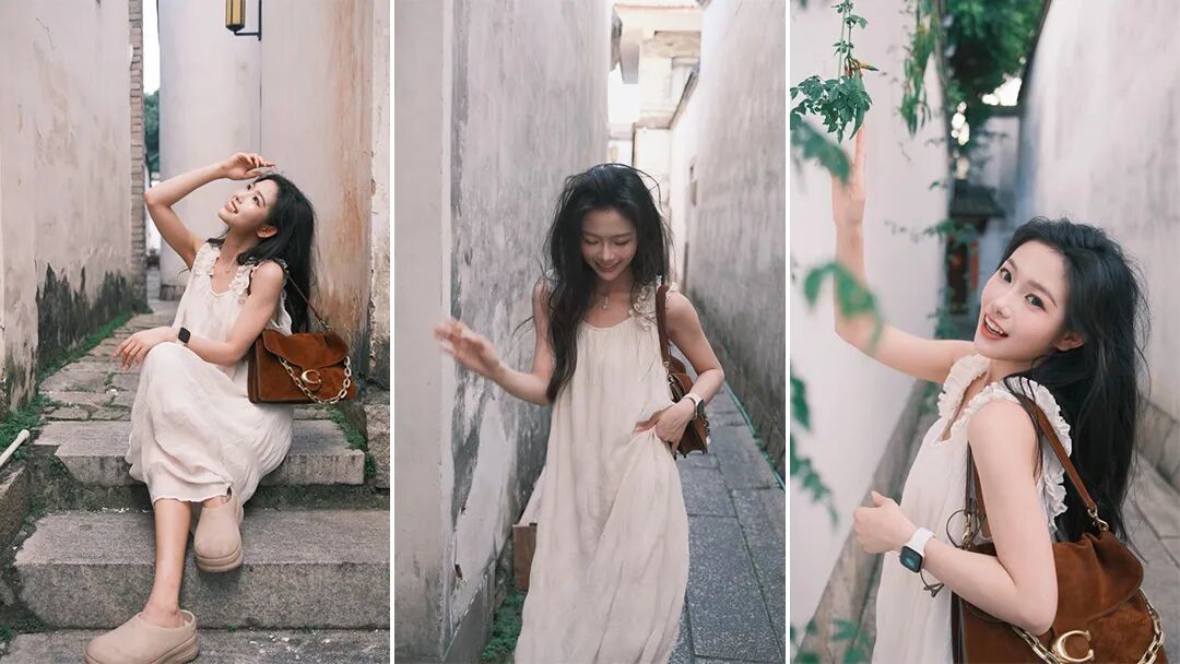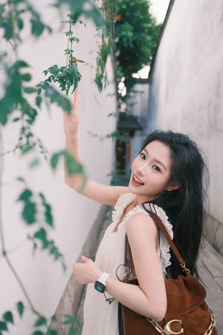 抬手整理发丝时身体微微后仰,目光侧望,让小巷的悠长感在背景中延伸。整理头发的动作自然优雅,似在小巷中享受独处时光,温柔中藏着故事感,发圈必成焦点。