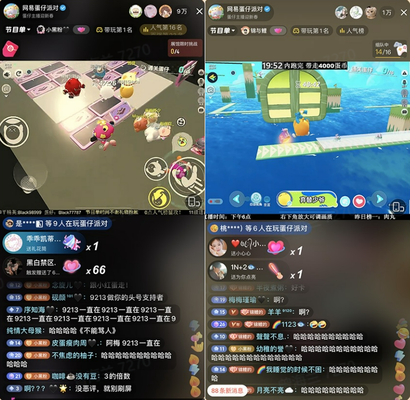 2024新春环游记:小黑粉(左)、锦与鲤(右)直播《蛋仔派对》
