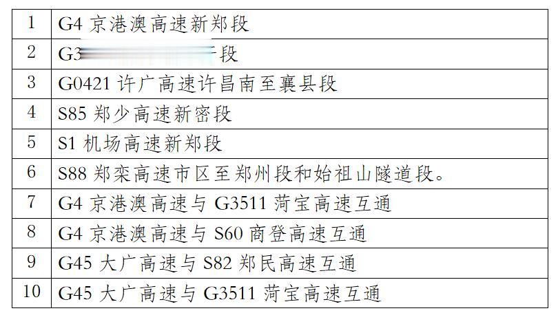 元旦期间,以郑州为中心向外辐射的短途出行车流占全省比重较大,预计全省易堵路段分布情况如下: