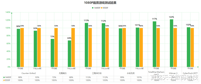 首先在1080P画质下,在《CS2》、《无畏契约》这两款游戏下,9500F无论是平均帧还是1%Low帧都是要强于14490F的。但到了《永劫无间》这款游戏,平均帧是9500F更强,1%Low帧则是14490F更强。而《三角洲行动》无论是平均帧还是1%Low帧都是英特尔要明显强于AM,D。而像《三国全面战争》、《杀手3》以及《赛博朋克2077》,9500F已经连平均帧都领先不了14490F了。