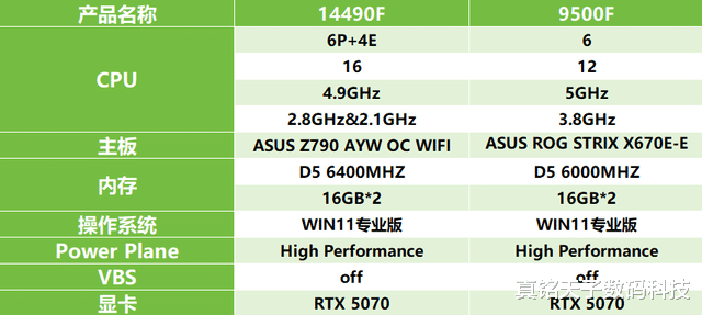 这次我们用英特尔的14490F与9500F进行实际的测试对比,从不同类型游戏的实际测试效果来看看这颗处理器到底是怎样的。双方的测试配置以及CPU本身的差异如下图: