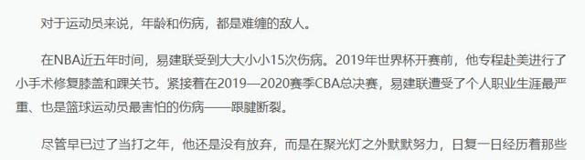 在职业生涯里,易建联遭受了许多伤病,甚至还遭遇了堪称篮球运动员噩梦的跟腱断裂。