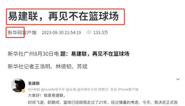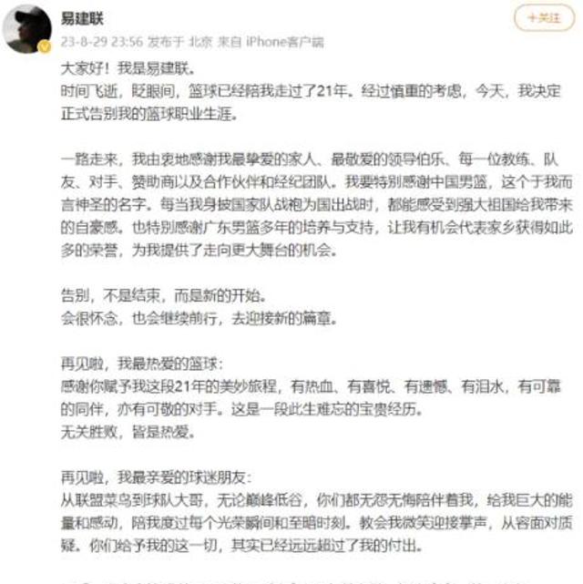 2023年8月,易建联在经过深思熟虑后正式宣布告别篮球职业赛场,这一消息一出,无数粉丝为他送上祝福。