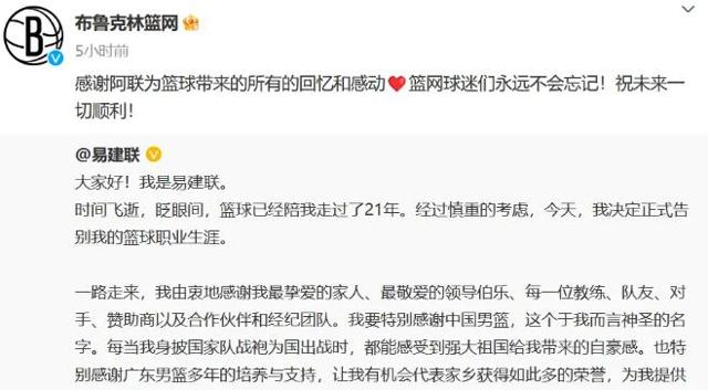 转战NBA后,易建联在赛场上的表现依旧抢眼,甚至就连他退役时,布鲁克林篮网队也送上祝福。
