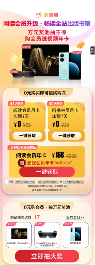 趁着双11,华为阅读的年卡也有特惠,买华为阅读年卡送华为影视年卡,还能参加抽奖活动!