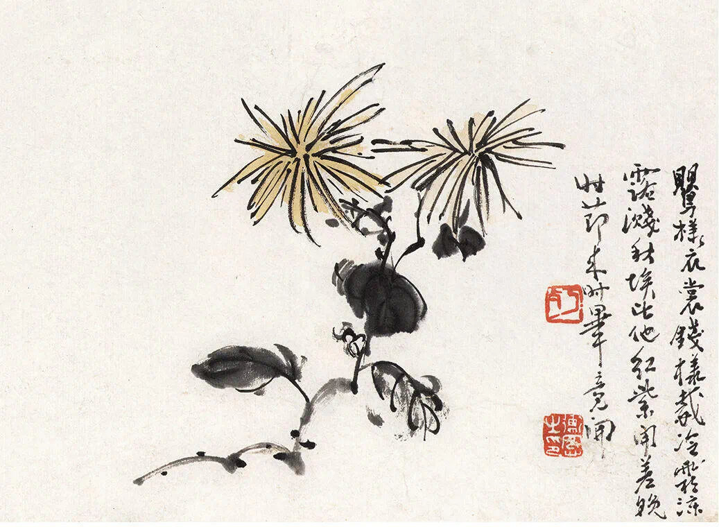 另一开画菊,更见"逸笔"的妙。菊叶用淡赭石扫了几笔,叶脉虚虚一带,像被秋风吹得卷了边;花瓣是碎碎的白,掺着点鹅黄,不规整,却透着"不是花中偏爱菊"的憨。陈师曾没画满幅,留白占了大半,倒像诗里没说尽的话,让看画的人自己去填——是篱边的风,还是阶前的月?留白里全是想象。