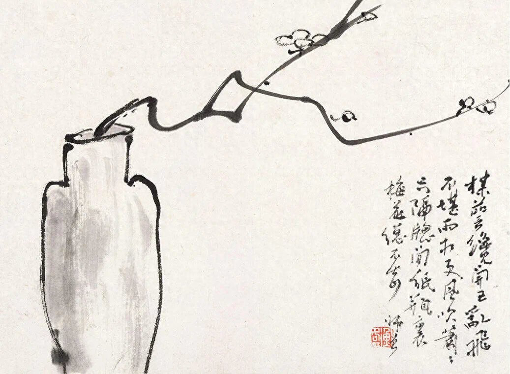 看那开《瓶梅》,墨色淡得像蒙着层雾。梅枝从瓶里斜出来,不讲究对称,却歪得有章法,像杨万里写的"一枝梅粉褪残妆",带着点落拓的雅。花瓣用清水晕染,只在尖端蘸了点焦墨,像被风吹薄的雪,连瓶身的线条都懒懒洋洋,几笔勾出轮廓,却让人觉得那瓷瓶里,定插着刚从园子里折的新梅。