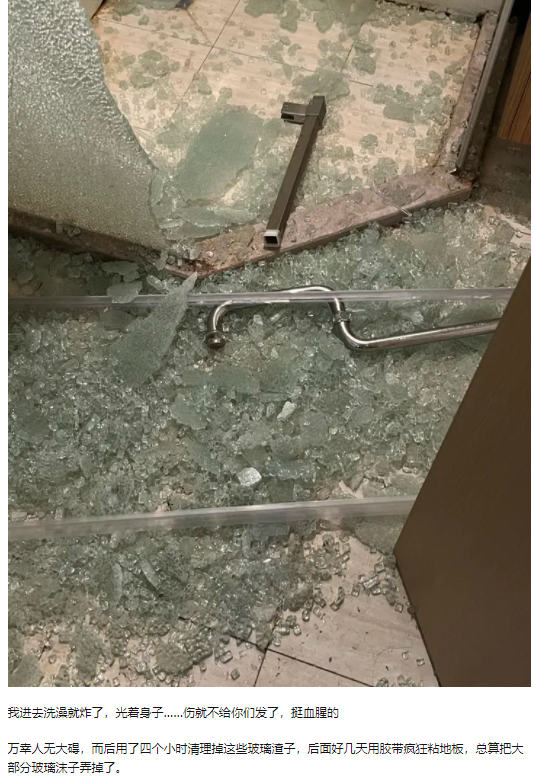 但如果玻璃淋浴房的质量不好的话,确实也存在着“自爆”的安全隐患, 比如像下面这位网友。