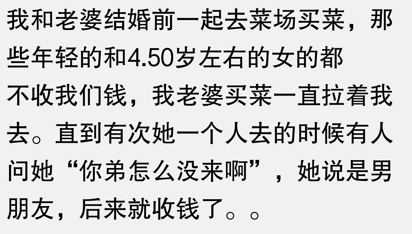 19. 菜场买菜,年轻女孩不收钱,老婆一个人去就收,这是什么操作?