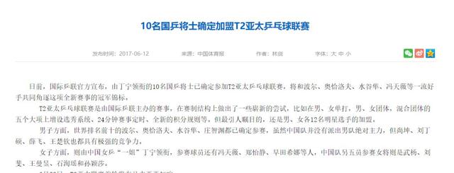 中国体育部:(10名国乒将士确定加盟T2亚太乒乓球联赛2017.06.12)
