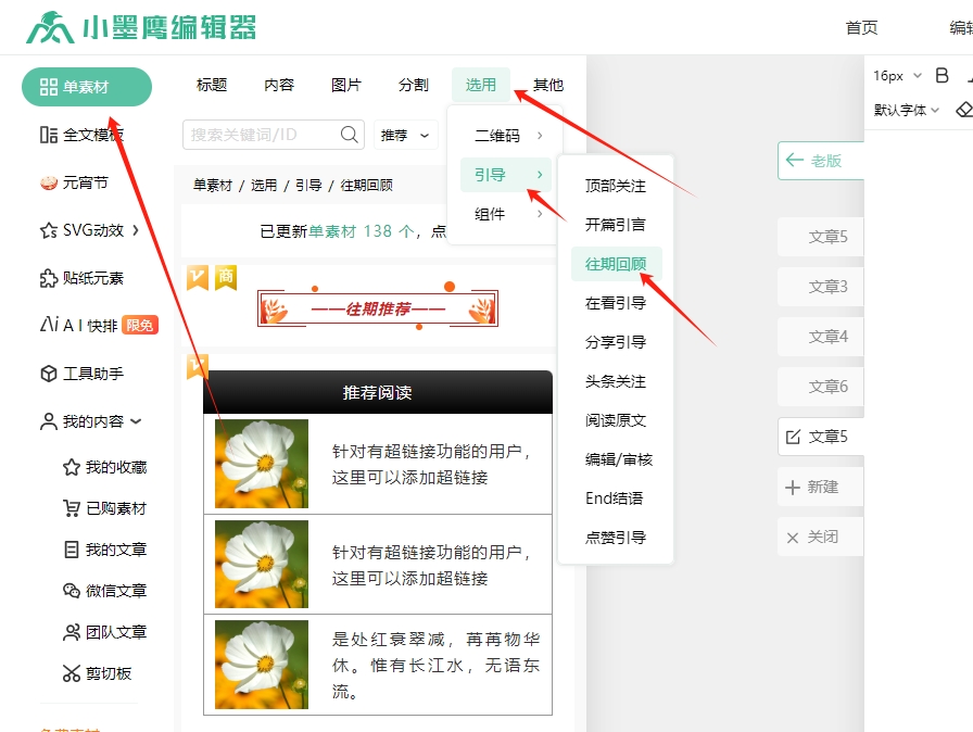 首先,打开小墨鹰编辑器,在左边的单样式里找到“选用-引导 - 往期回顾”这一项。