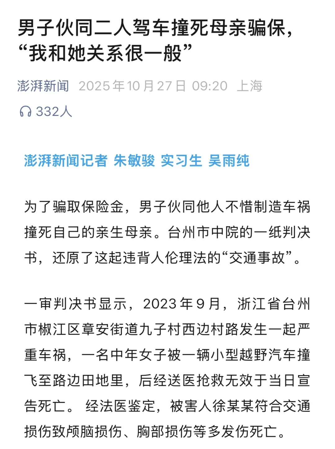最近几天,浙江台州的一起案件震惊全国。在澎湃新闻发布的报道中,一桩“人为制造车祸骗保”的案件细节曝光,让无数人读完之后久久不能平静。