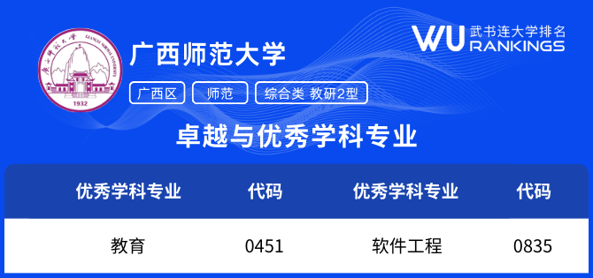 广西师范大学2个优秀学科专业,桂林电子科技大学、广西艺术学院各1个优秀学科专业。