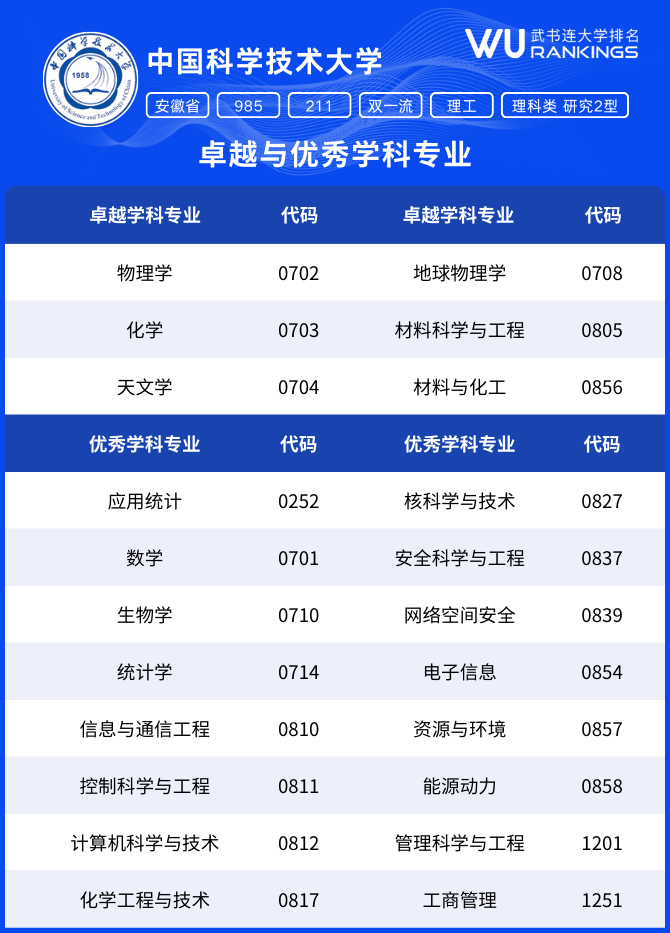 安徽省各大学卓越与优秀学科专业中国科学技术大学