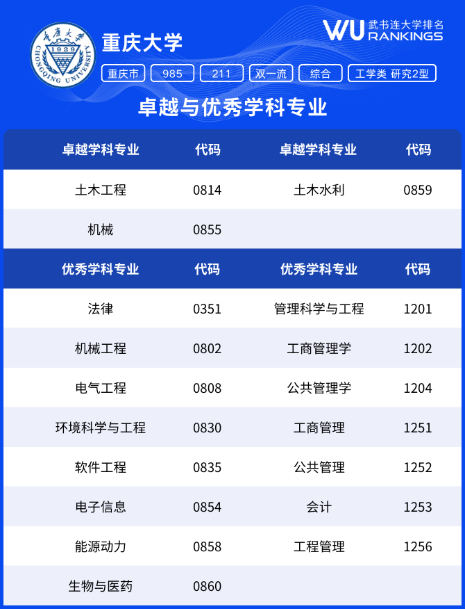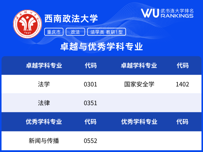 西南政法大学、重庆大学各3个卓越学科专业,西南大学1个卓越学科专业。