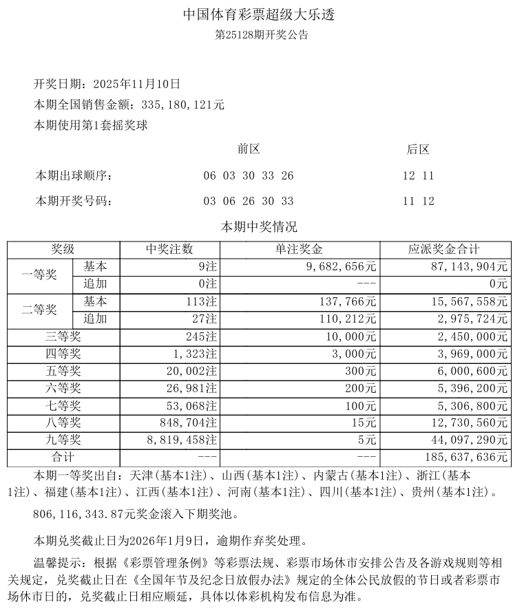 销售:3.35亿多元;奖池:8.06亿多元。