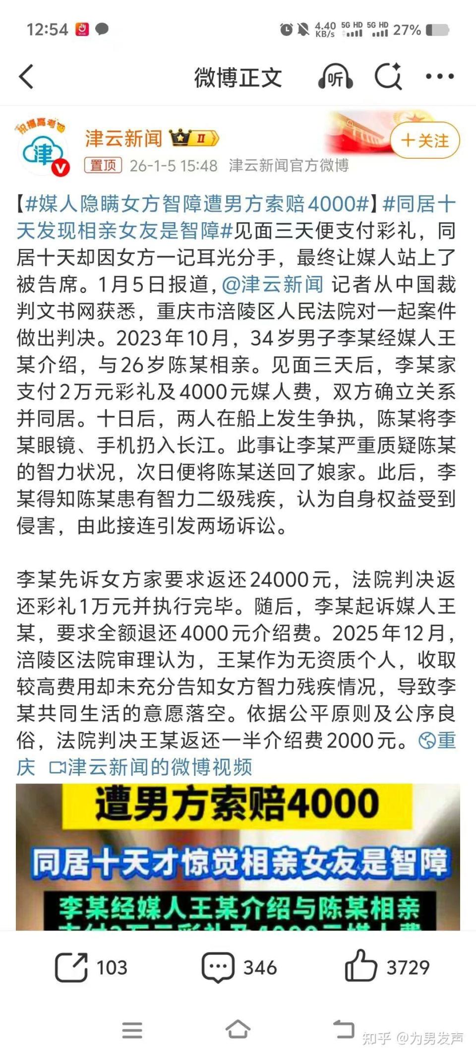 2、媒人明明知道,但为了赚这4000块,故意把智障女包装成“文静、内向”推销给急于结婚的大龄男。
