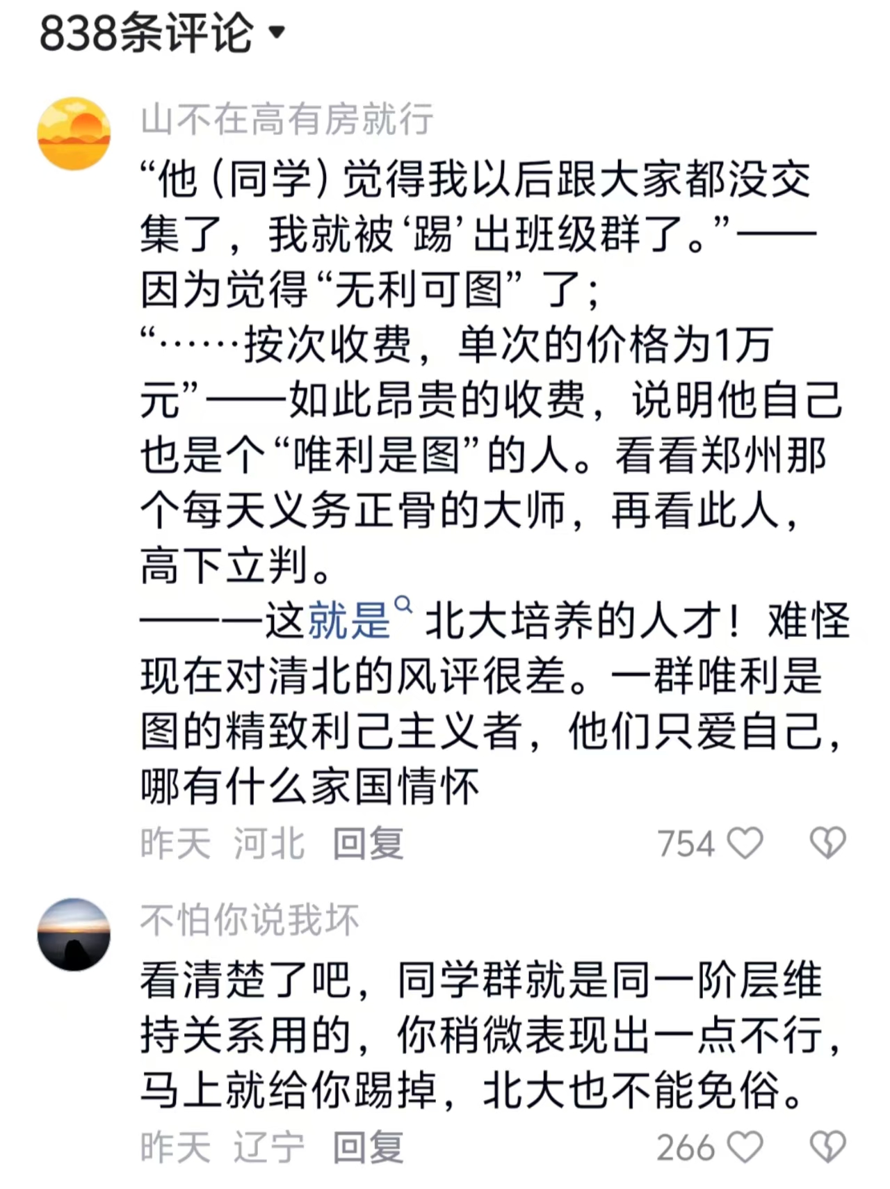 而在张乐超走红网络之后,评论区的网友们却一语道破了现实:张乐超的同学把他踢出群,不是因为别的,就是因为他已经“无利可图”了,名校毕业生看待资源和发展比普通人更加客观理智。