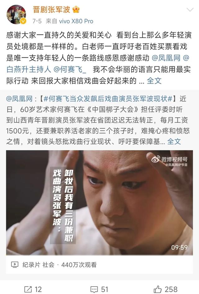 一个多月前,何赛飞在节目《戏聚高平·擂响中华——中国梆子大会》里担任评委时,曾为一个基层的晋剧戏曲演员张军波鸣过一次不平。