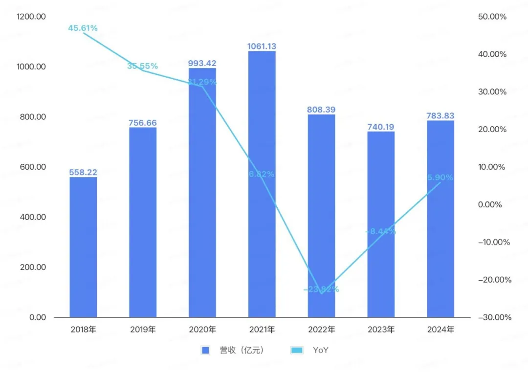 具体来看,去年整体营收的回升,是由海外业务带动的,而国内营收自2021年以来逐步从787.14亿元萎缩至去年的295.22亿元,已不足巅峰时的四成。