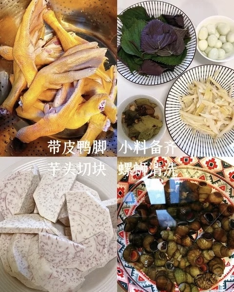 重头戏在于炒料与炖煮。另起锅,留少许底油,放入姜片、蒜瓣、葱段爆香,再加入大量紫苏叶、酸笋片、辣椒段和一勺豆瓣酱,小火慢炒出红油与香气。紫苏是这道菜的灵魂之一,其独特的辛香能去腥提鲜,与田螺、鸭脚完美融合。炒香后,加入适量清水或高汤,放入八角、桂皮、香叶、草果等香料,再调入生抽、老抽、蚝油、冰糖和少许米酒,大火烧开。