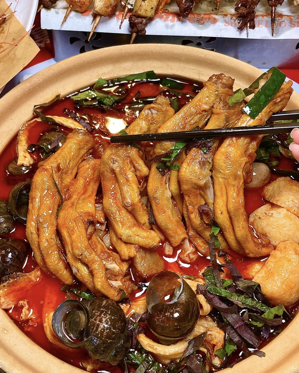 在岭南的夏夜街头,最撩动人心的,莫过于一锅热气腾腾、香气扑鼻的田螺鸭脚煲。炭火慢煨,砂锅咕嘟作响,揭开锅盖的瞬间,浓郁的酱香混着香料气息直冲鼻腔,田螺吸得滋溜响,鸭脚软糯脱骨,连汤汁都成了拌饭的珍宝。这道源自两广地区的民间风味,看似粗犷,实则讲究火候与搭配,是宵夜档口的招牌,也能成为家庭餐桌上的硬核暖菜。它不精致,却足够真实;不轻盈,却让人念念不忘。每当我想起那个围坐小桌、手套沾油、嗦螺啃鸭脚的夜晚,便知,这道菜早已不只是味道,而是生活的温度。