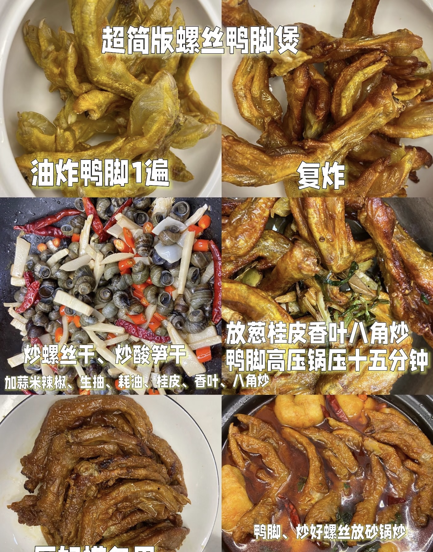 接下来是炸制鸭脚。锅中倒油,烧至六成热,放入鸭脚,中火炸至表皮微黄起皱,捞出沥油。炸过的鸭脚在后续炖煮中更易入味,口感也更软糯有弹性。炸好后,将田螺和鸭脚一同放入砂锅或深锅中备用。