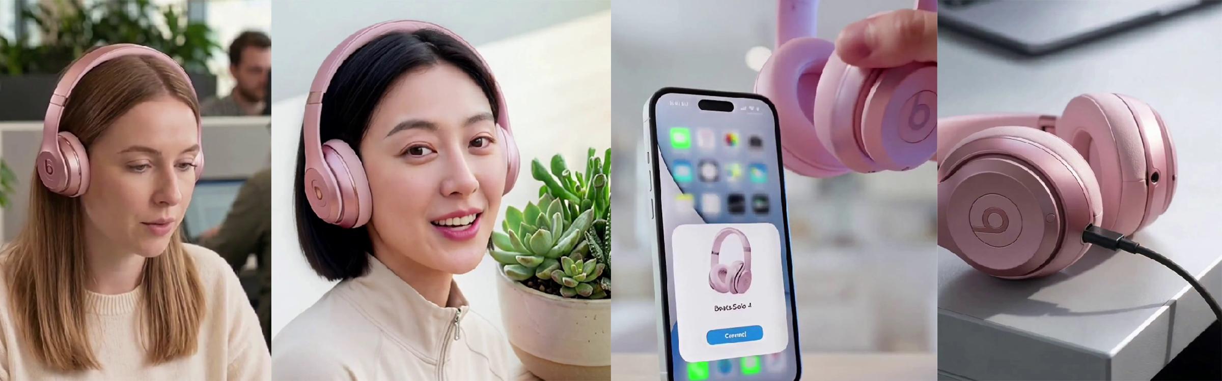 在耳机展示视频中,不论是在有人物佩戴的画面,还是产品空镜,亦或是产品充电、连接手机等功能展示环节,耳机的外观、色彩、LOGO都能有准确还原。