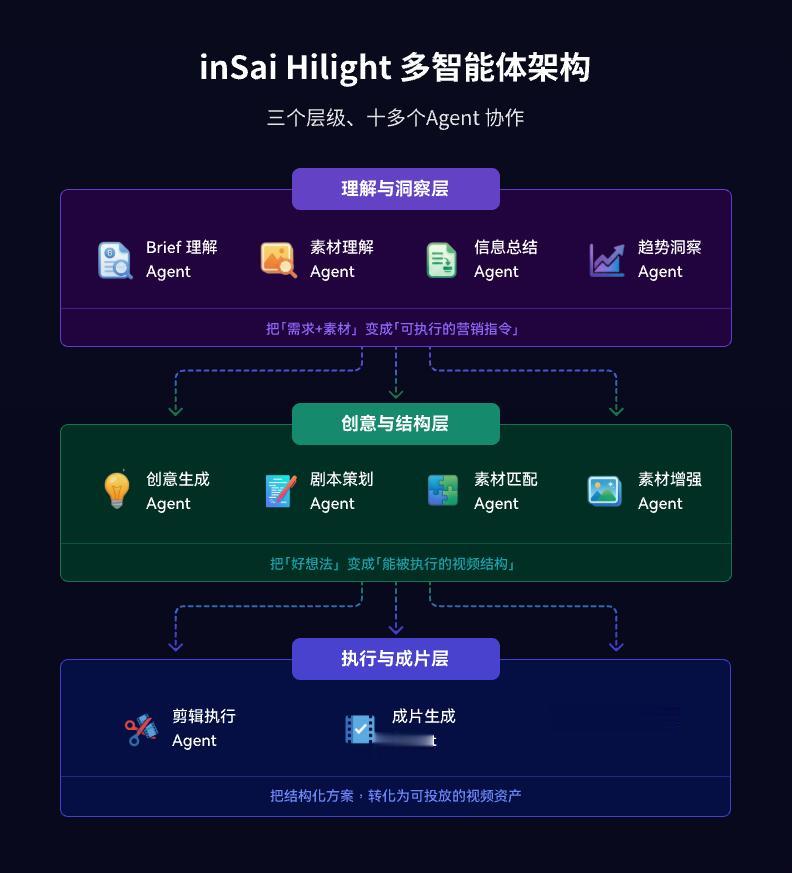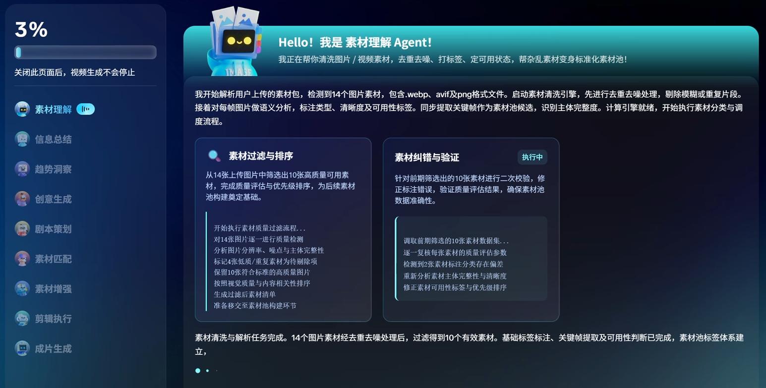 最后在执行与成片层,剪辑执行、成片生成、质检复盘三个Agent会最终制作出视频成品并复检,甚至还能将结果反哺系统,形成良性迭代循环。