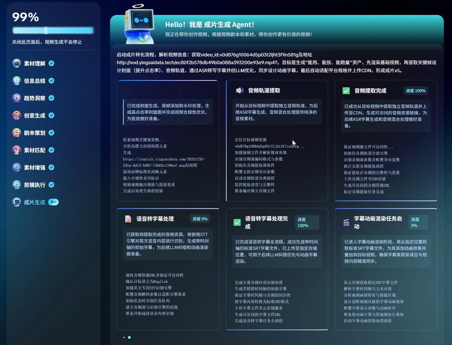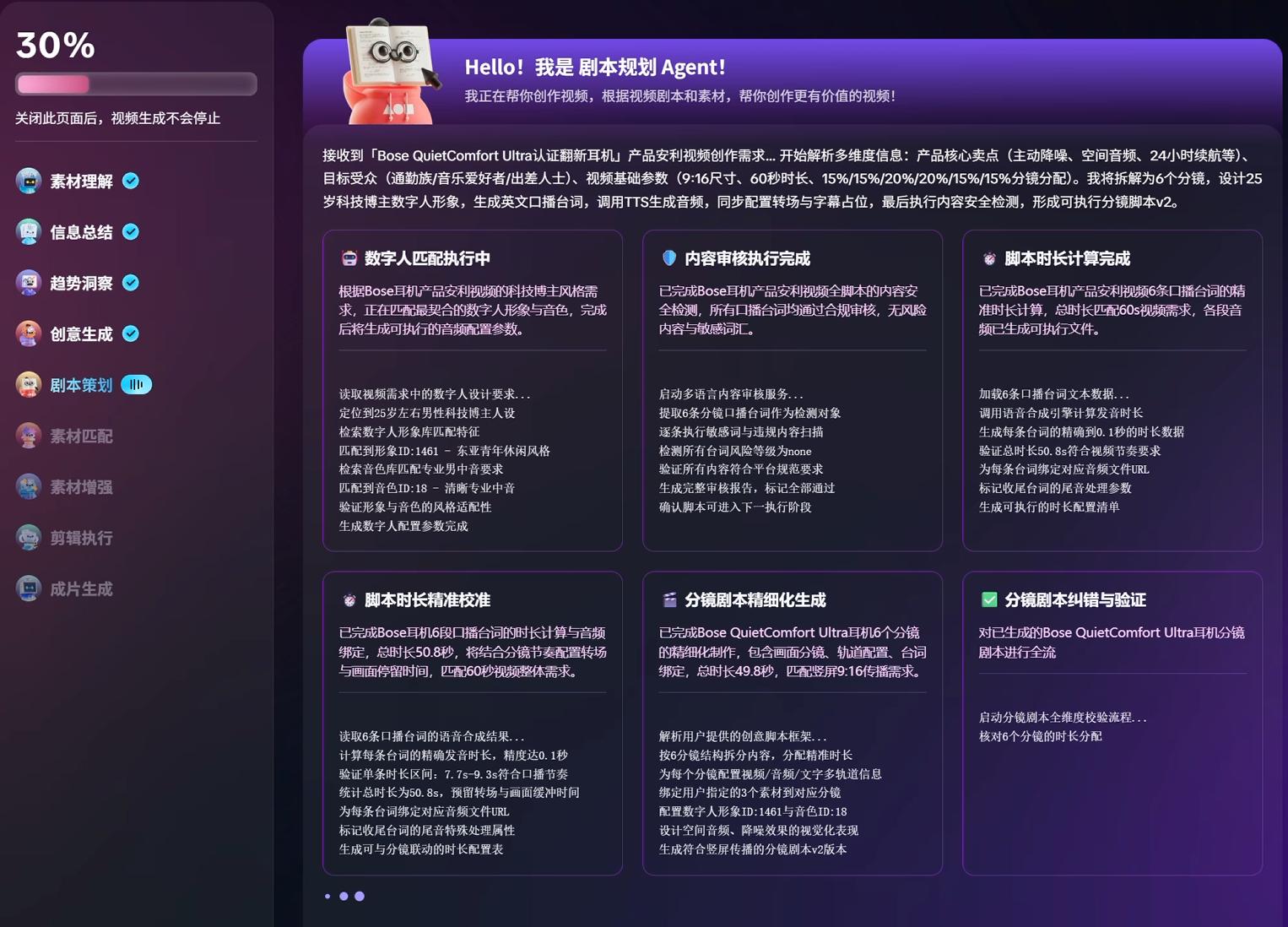 具体来看,我们只需要一条链接或上传商品图就能一键生成营销视频,从脚本生成、镜头匹配、剪辑渲染到多平台适配,整个流程清晰可见,并且还可控。甚至每个Agent负责哪些内容都有直观呈现,就如同今天大模型领域的“深度思考”过程。