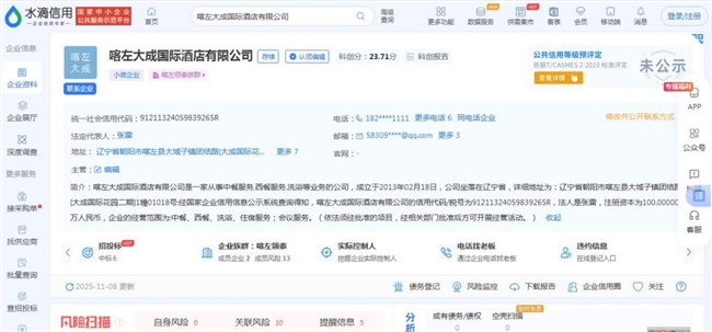 据网络公开资料显示,大成国际酒店是喀左县四星标准高档宾馆,酒店整体建筑面积约3万㎡,酒店主楼高9层,呈v字型设计,拥有122间客房,可同时容纳1500人就餐。喀左大成国际酒店有限公司,2013年02月18日成立,经营范围包括为酒店建设项目提供管理服务。