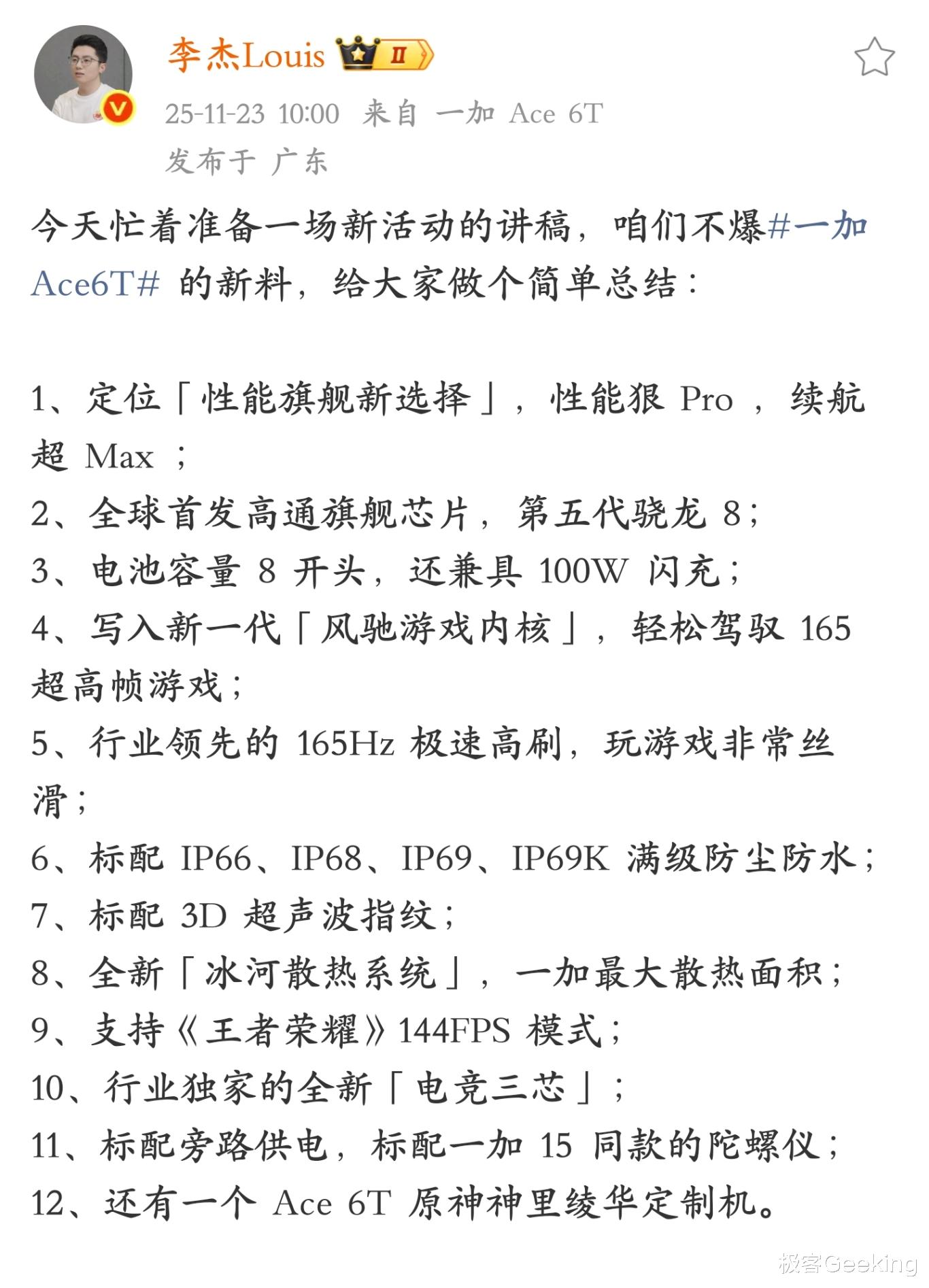 官方还透露了更多主要配置规格信息,包括 IP68、IP69 和 IP69K 的满级防尘防水,并标配 3D 超声波指纹、旁路供电、一加 15 同款陀螺仪,以及游戏支持《王者荣耀》144FPS 模式等。
