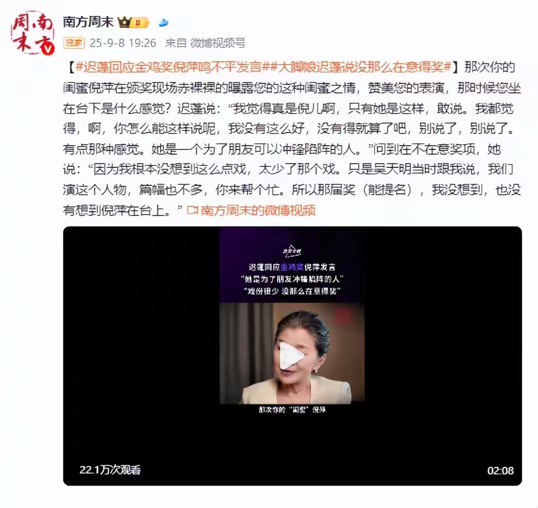 倪萍作为颁奖嘉宾,不顾巨大的压力,公开在颁奖台上为迟蓬站台,为她鸣不平。