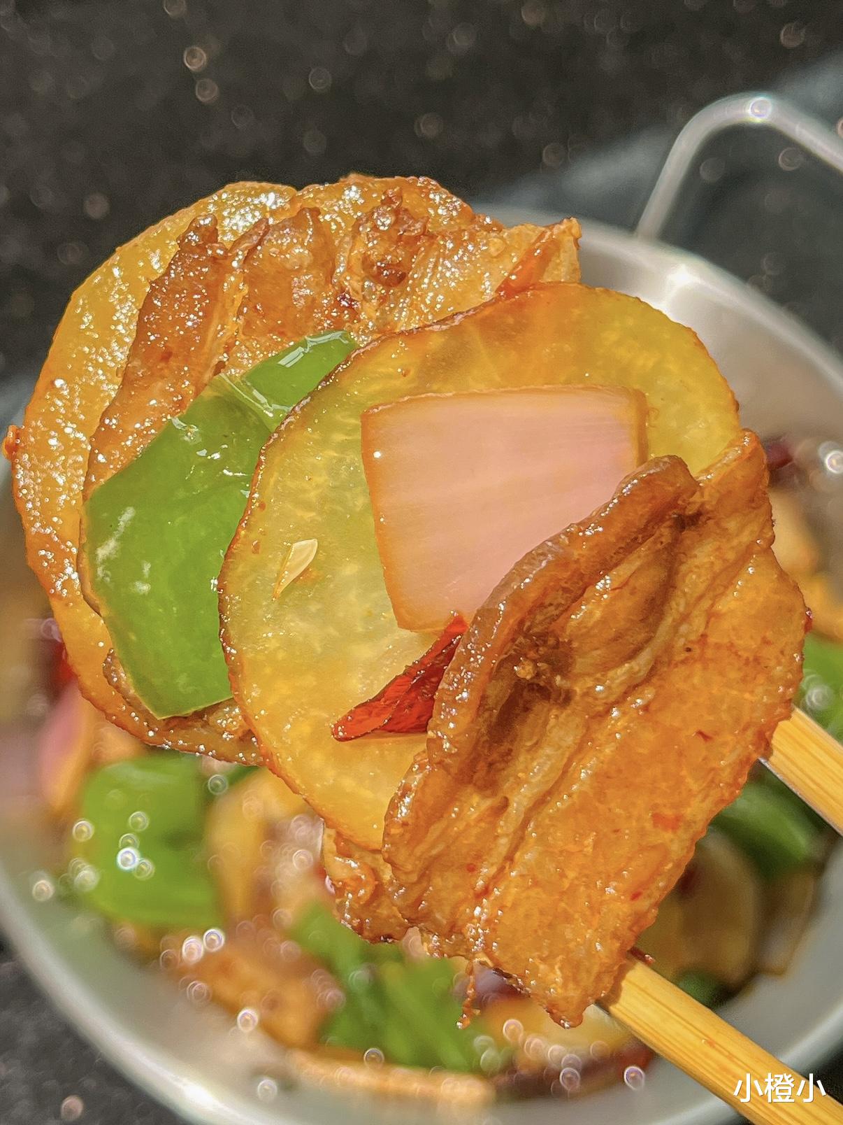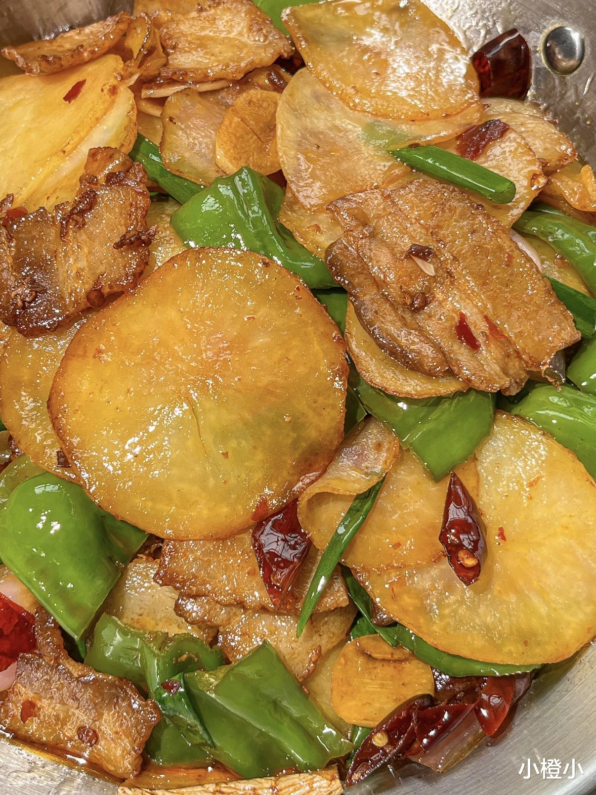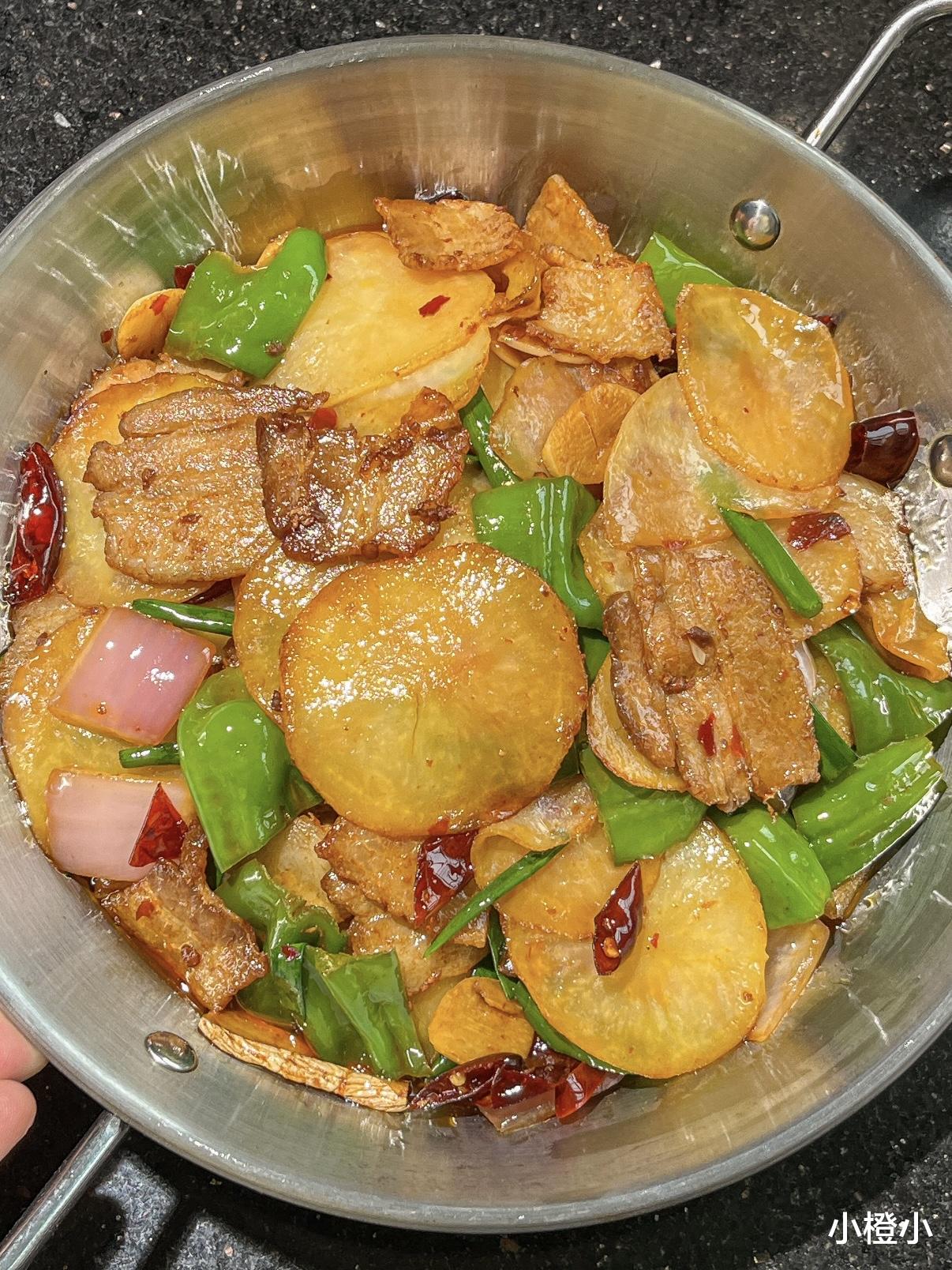 锅烧热,倒油(平时炒菜量),筷子立周围冒小泡就OK。土豆片滑进去,30秒定型再动勺,中火煎到边缘微焦、中心透明,立马捞出,动作慢一秒都算你对脆感不尊重。余油别倒,直接下五花肉,小火慢慢煸,把油逼出来,肉片呈灯盏状时,扒拉到一边,空出的“小油湖”里放姜蒜干辣椒,“滋啦”一声,麻辣味像烟花炸开!
