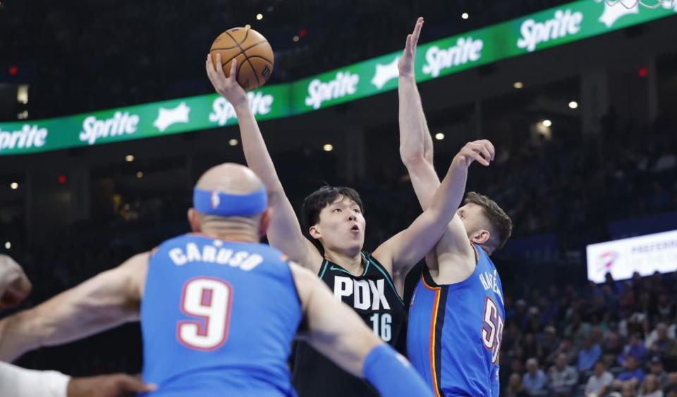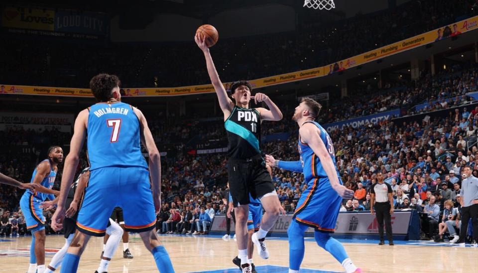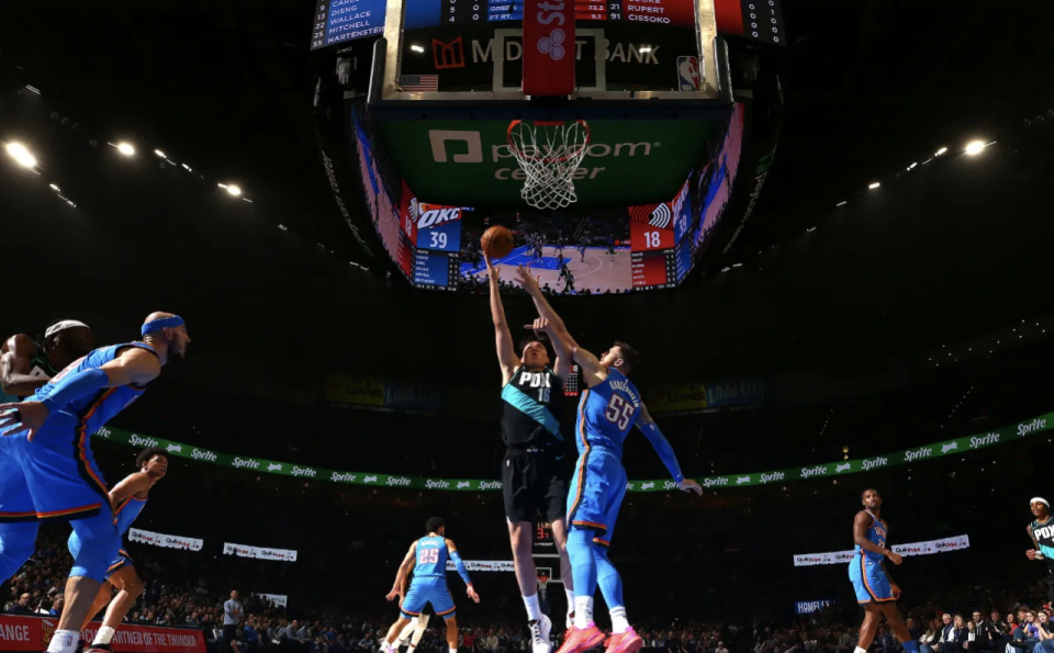 当波特兰开拓者在客场以95比122惨败给俄克拉荷马雷霆的终场哨声响起时,比分牌上那巨大的27分分差虽然刺眼,但对于许多守候在屏幕前的中国球迷来说,最令人揪心的一幕并非输球本身。转播镜头的余光捕捉到了这样一个画面:在比赛进入最后的读秒阶段,那个身披开拓者战袍的中国大个子,正双手叉腰,大口大口地喘着粗气,汗水顺着脸颊不住地流淌。这一刻,杨瀚森的疲态尽显无遗,他仿佛刚刚经历了一场超负荷的极限拉练。