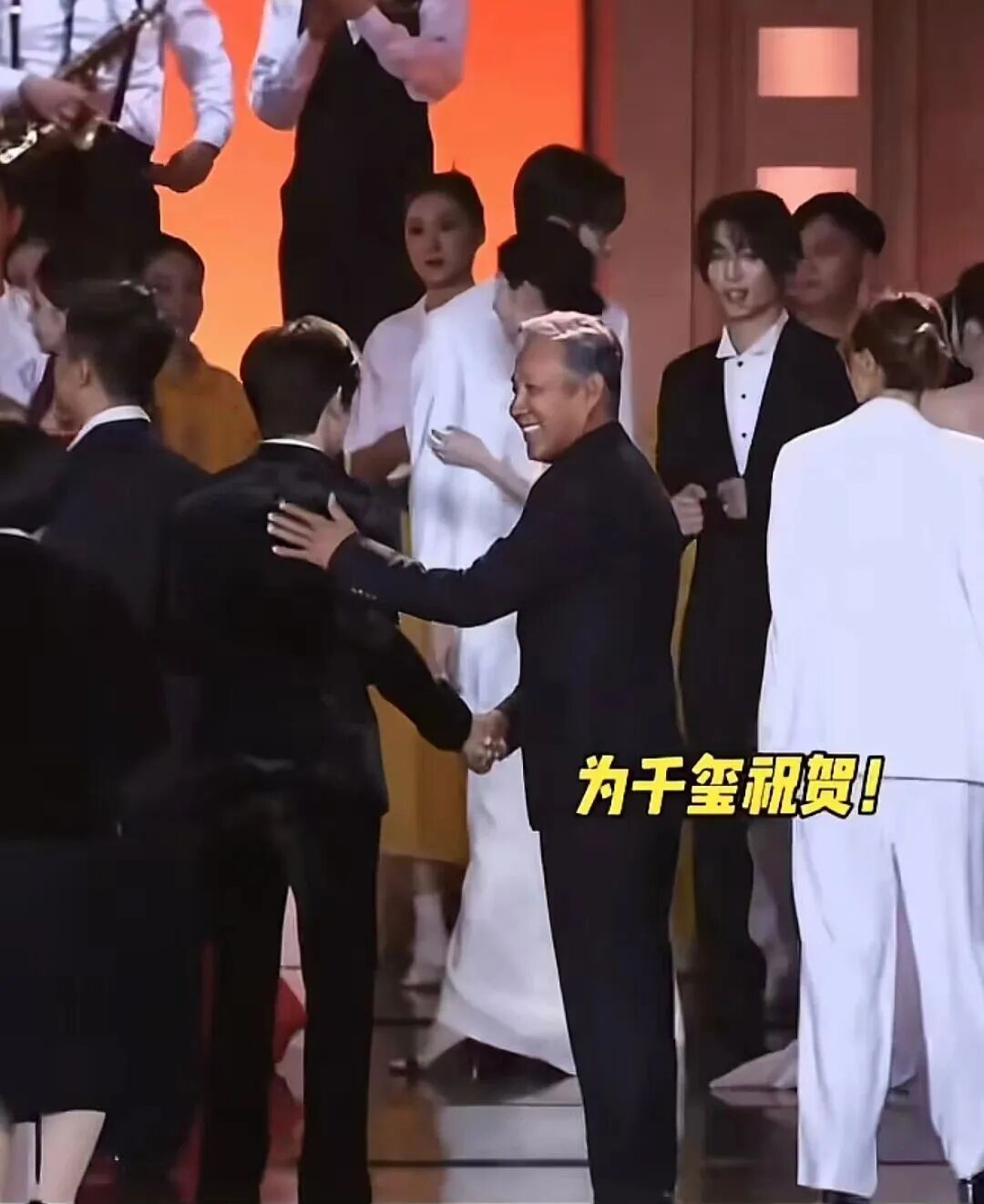 颁奖礼后,一个意味深长的画面被镜头捕捉:70岁的中国电影家协会主席陈道明,主动走向易烊千玺,面露笑容,紧紧握住他的手。