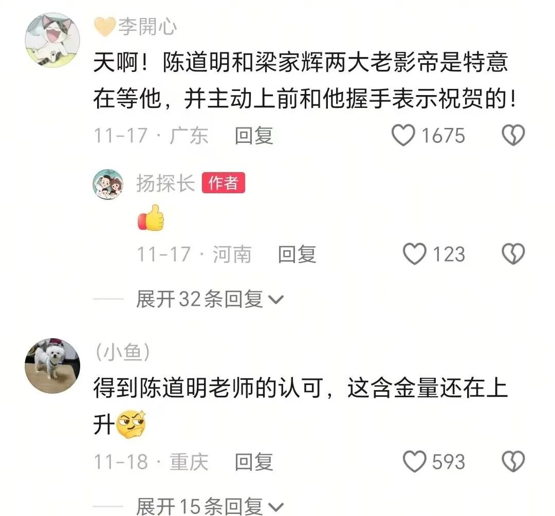陈道明:作为中国电影家协会主席,在颁奖结束后主动走近易烊千玺打招呼握手,用力拍了拍他的后背,面露欣赏的笑容。这一举动被广泛解读为电影界核心层对这位年轻演员的最高认可。