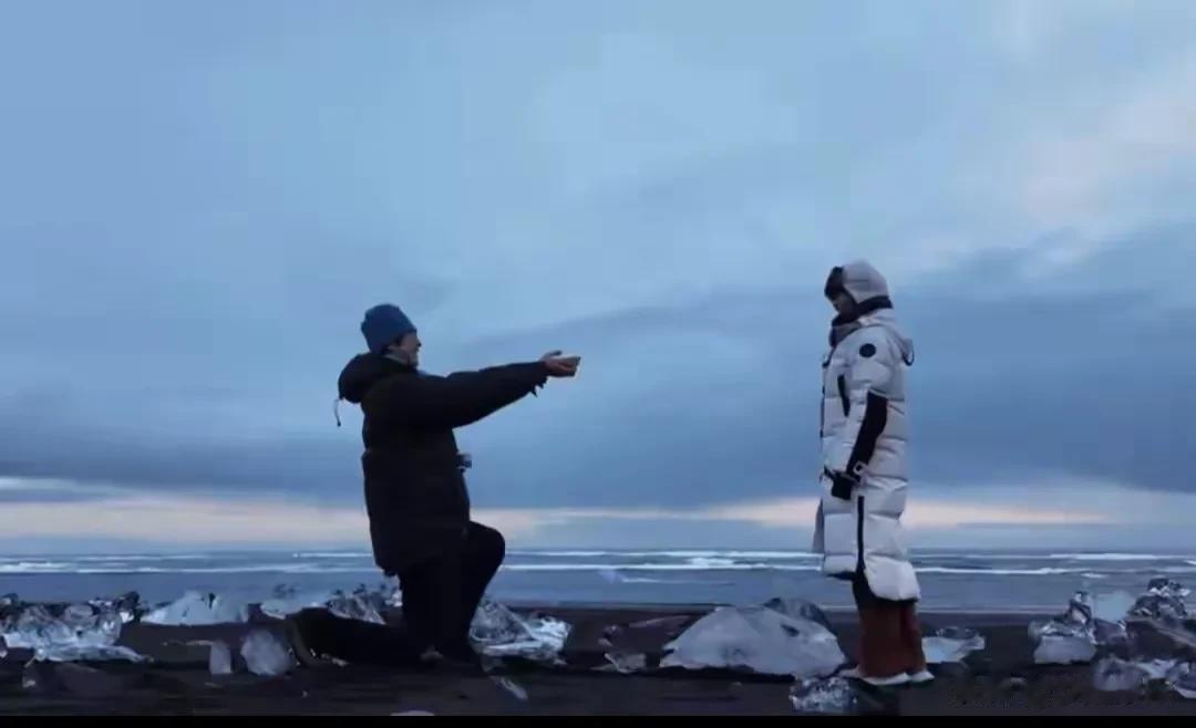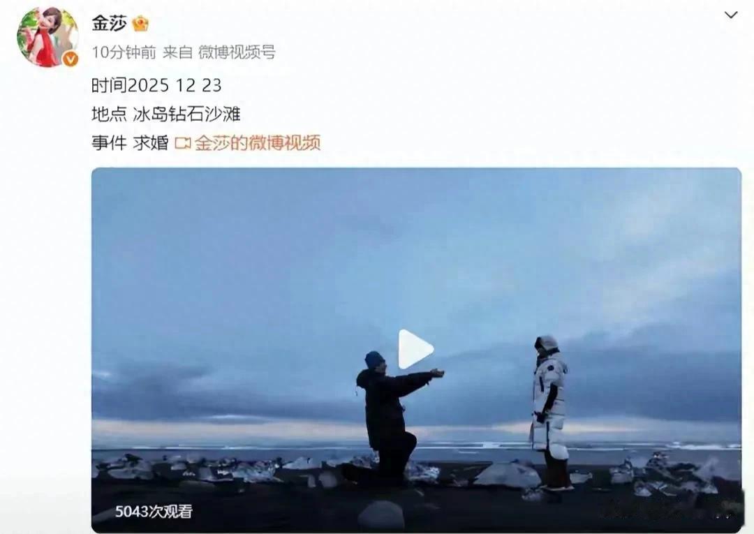 42岁的金莎被小17岁的男友孙丞潇在冰岛钻石沙滩求婚了!这剧情比偶像剧还魔幻:黑沙滩上飘着极光,小鲜肉单膝跪地手抖得像帕金森,喊着"想宠你一辈子",把"女大三抱金砖"的祖训直接改写成"女大十九天长地久"。
