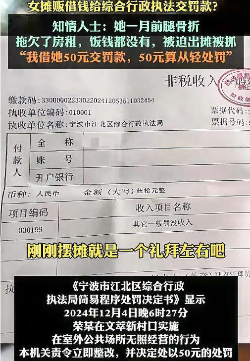截止到目前,该涉事女摊贩已借50元钱缴纳了罚款。