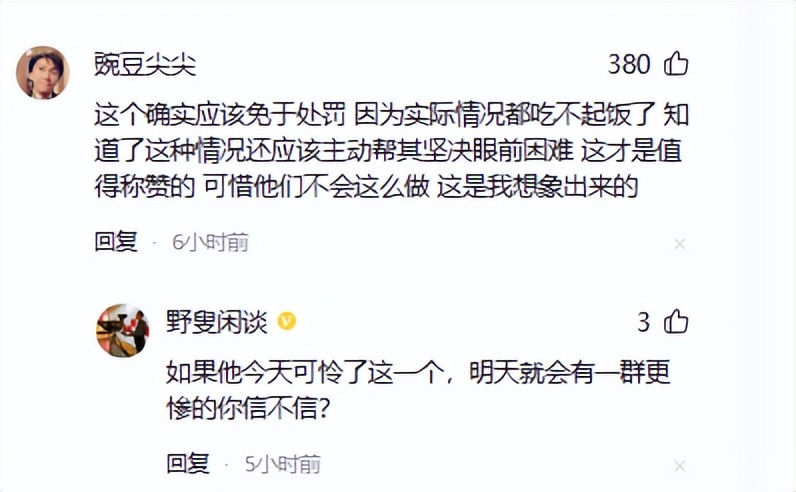 也有网友认为,这个确实应该免于处罚,因为实际情况都吃不起饭了,执法人员在知道了这种情况后,应该主动帮其解决眼前困难,这才是值得称赞的,而不是按照规则死板执法!