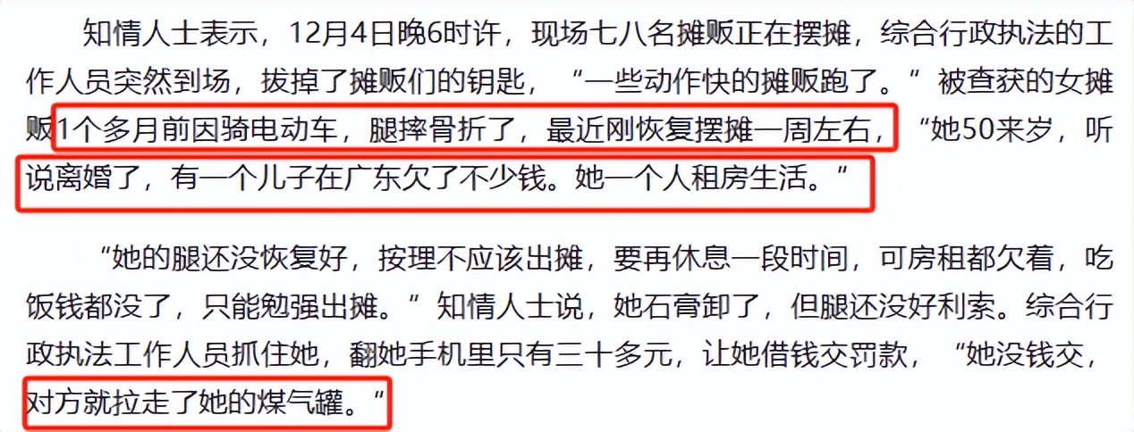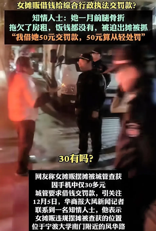 12月5日,据大风新闻报道称:12月4日,一段“女摊贩摆摊被城管查获后被罚50元,因手机中仅30多元,城管要求借钱交罚款”一事引发大量网友关注。