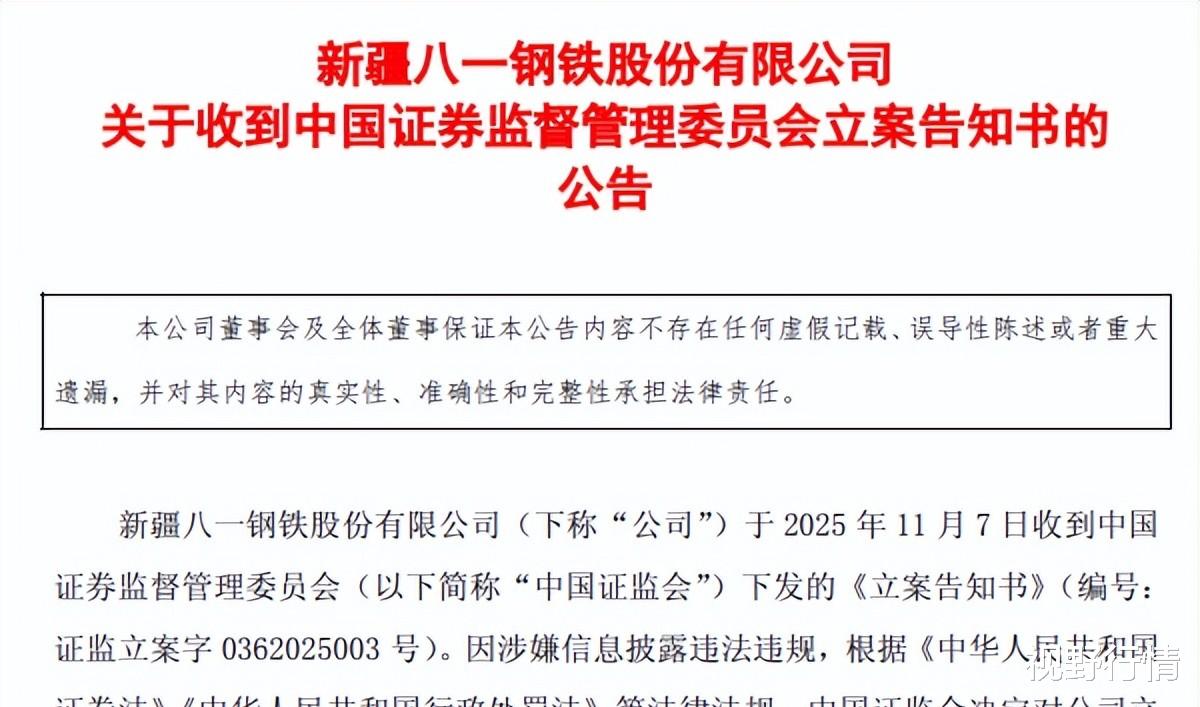 11 月 7 日收市后,八一钢铁接连甩出两份《立案告知书》—— 上市公司与控股股东新疆八一钢铁集团同时因涉嫌信披违规被证监会立案调查。