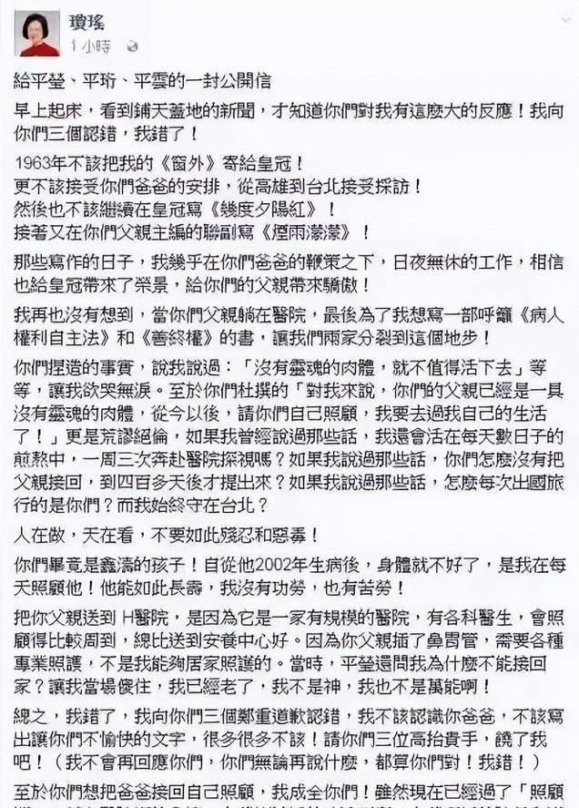 媒体的推波助澜,将琼瑶推上了舆论的风口浪尖,她承受着巨大的压力和非议。为了平息这场风波,身心俱疲的琼瑶选择妥协,她给三个继子女写了一封信,表示自己错了,让他们按照自己的意愿去救治父亲。信中,她恳求继子女的谅解,希望他们能够饶过她。