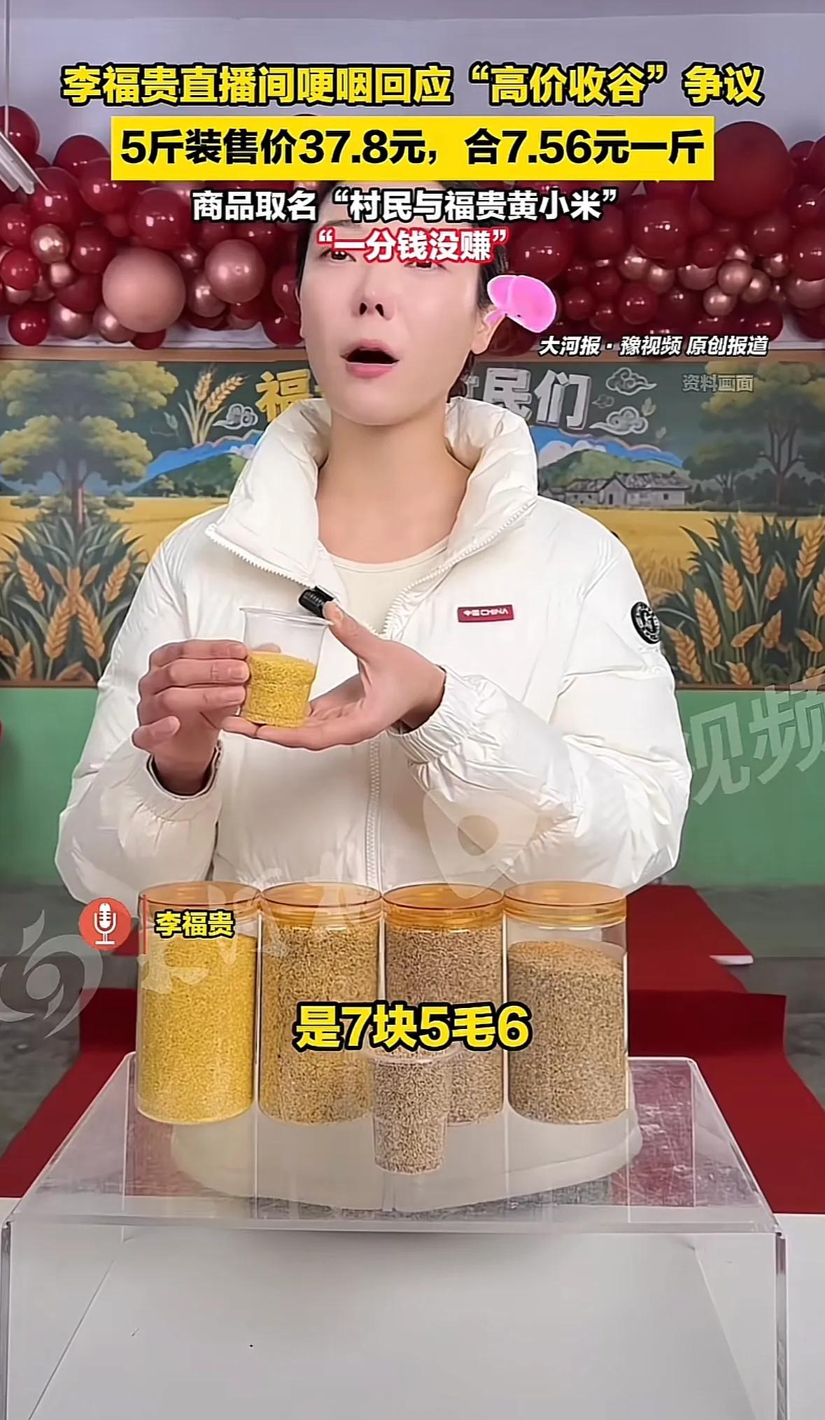 有网友质疑她高价收来的谷子会再高价卖给消费者,对此李福贵表示自己一分钱都不赚,甚至是赔钱卖,多少钱收来的就多少钱卖的,中间的加工成本她自己承担。