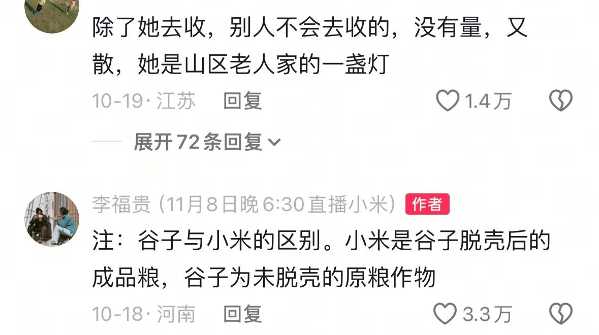 刚发布收谷子的时候,评论区网友炸锅了,因为从来没卖过这么高的价格。一般都是两三块钱,最高也就4块钱,但是李福贵给的价格是4.8元一斤,很多人觉得她是故意提高价格,引发了不少同行的不满。对此李福贵解释说这个价格在当地很正常,质量好的还有七八块钱一斤的呢,绝没有扰乱市场秩序。