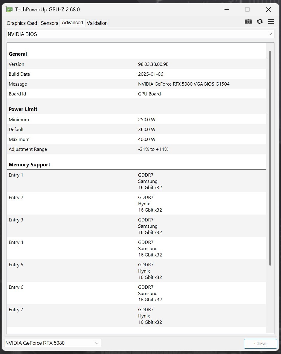 RTX5080金属大师OC使用GB203-400-A1 GPU核心,生产工艺为5nm,产地为中国台湾,具体生产日期为2025年第08周;显存部分采用来自三星的GDDR7,编号为K4VAF325ZC SC32,单颗显存容量为16Gb(即2GB一颗),单颗规格32bit/32Gbps,8颗显存共同组成256bit/16GB/32Gbps。