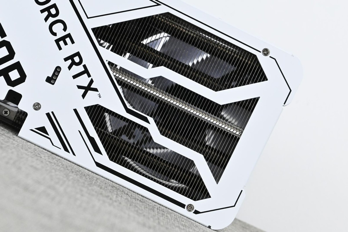 RTX5080金属大师OC使用全黑金属定制背板,背板尾部带来大面积镂空区间,搭配霜环风扇能轻松吹透散尾部热片,这种设计最初在fury/RTX20时代出现,一直沿用至今,可以说经得起时间考验了。