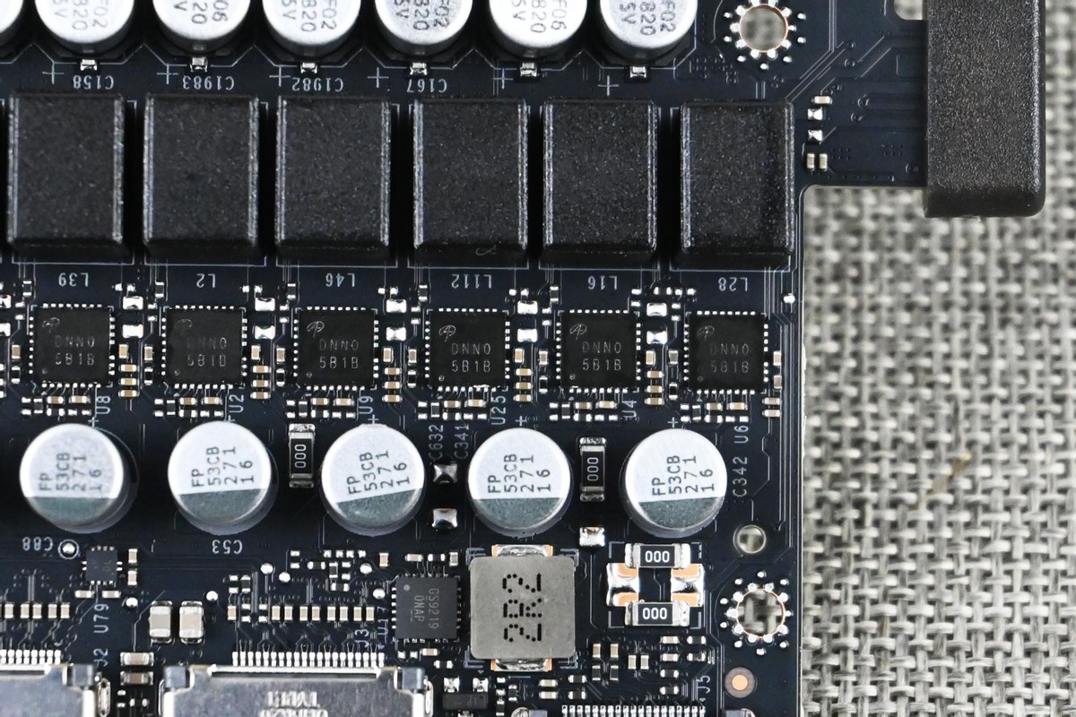 元件部分,RTX5080金属大师OC所有供电均采用固态电容和Alpha & Omega Semiconductor的AOZ5310NQI DrMos(SPS),核心供电R10电感,显存部分采用R22电感;另外,DrMos的AOZ5310NQI规格为60A。