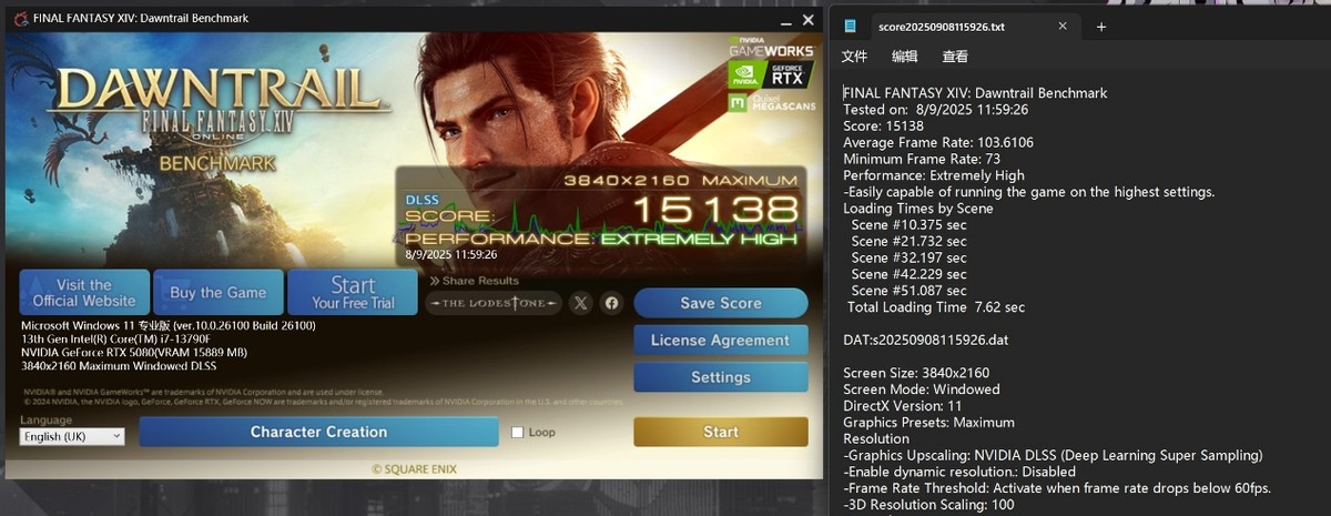 FF14 DAWNTRAIL benchmark在上个版本添加了DLSS,在跑分测试中,RTX5080金属大师OC取得了15138总分,平均103.6106帧,但作为日常网游来说解决4K优化问题更多可以归结于CPU,4K分辨率下建议搭配9950X或者285K游玩。